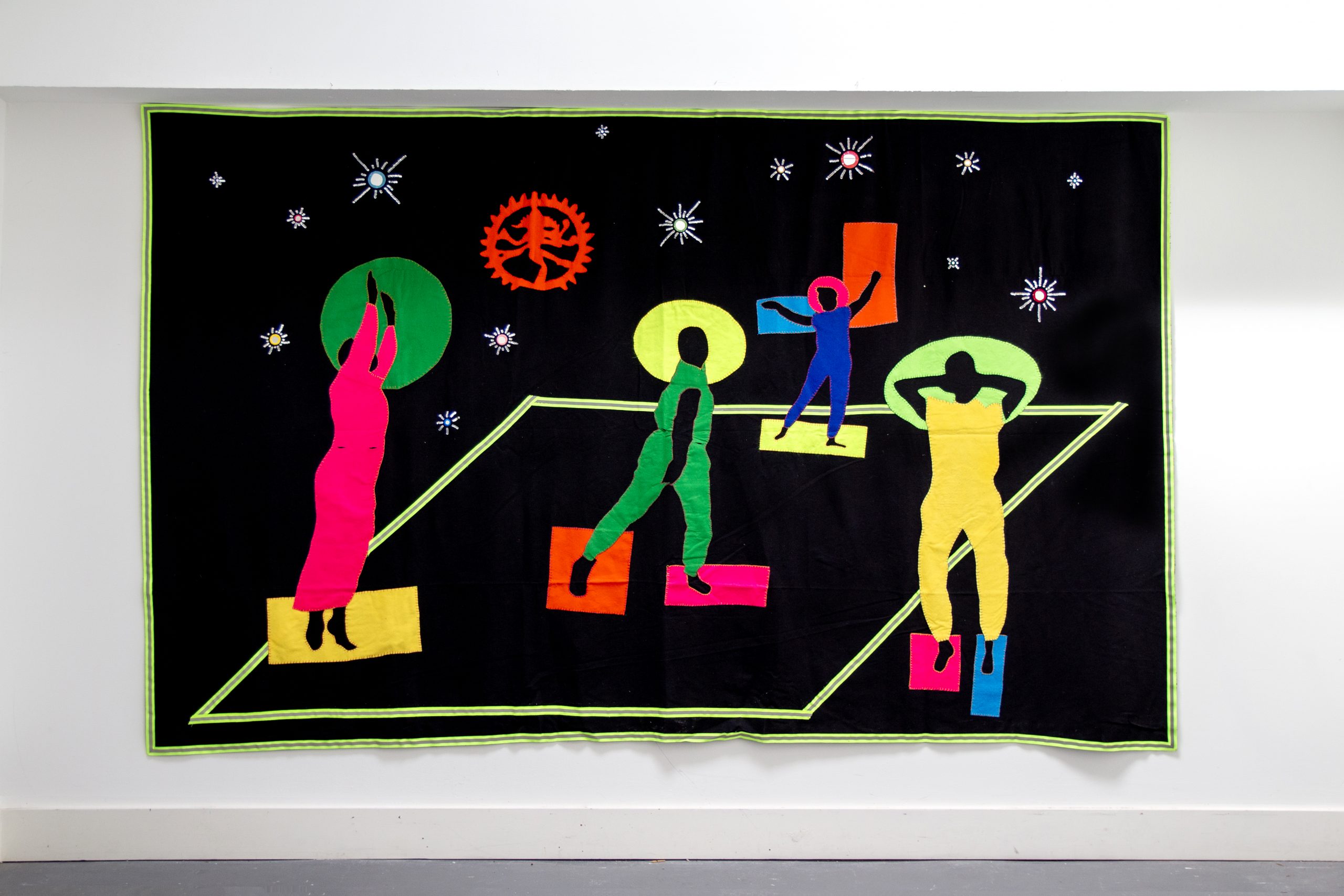 I was looking at the story of Draupadi, who’s one of the female characters in it, and then I became really interested in the other female characters and made a huge wall hanging, twelve metres long, depicting them. I’ve been running open studio sessions in Glasgow, so I’ve been inviting people to come in and help set up.