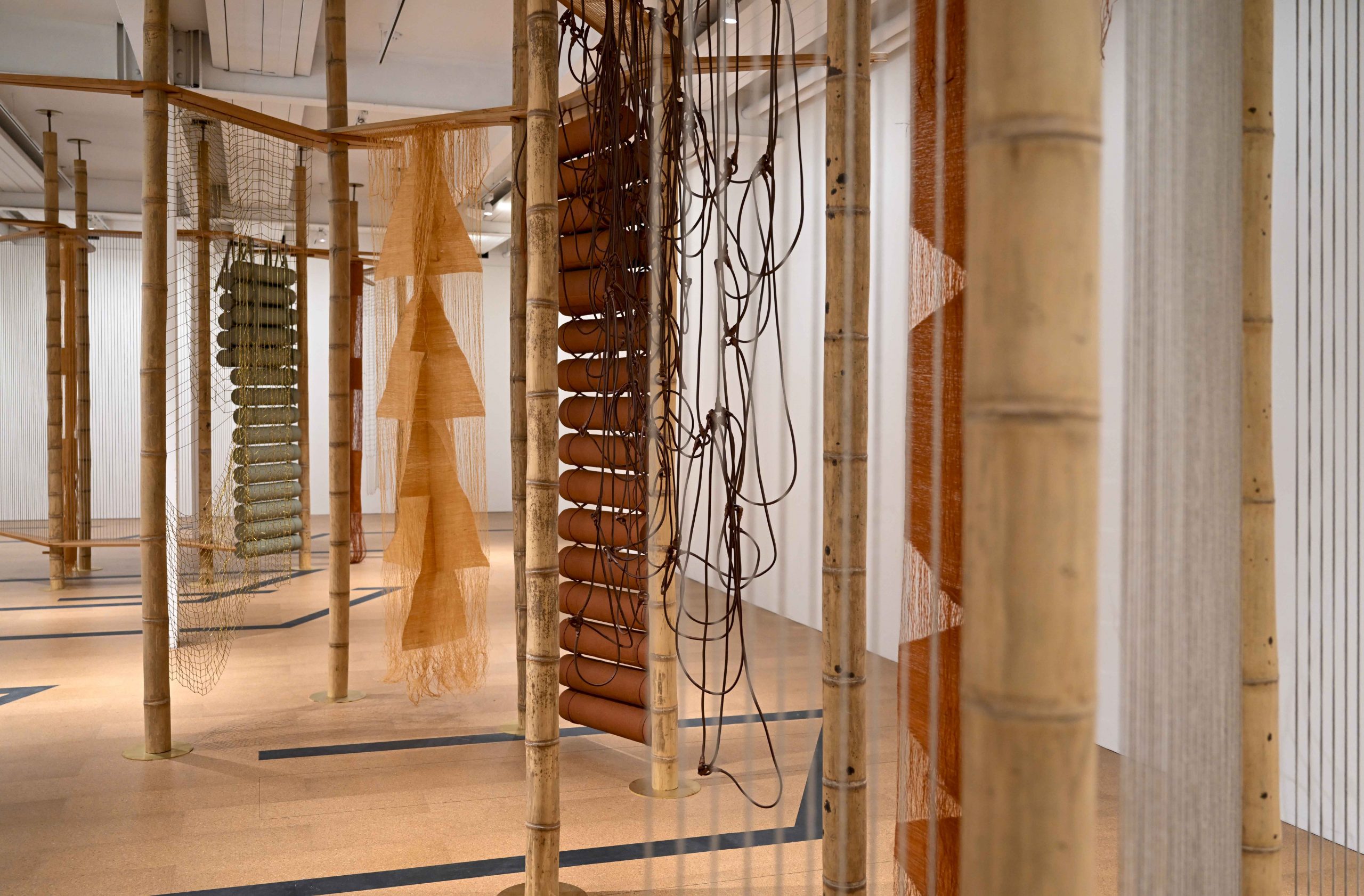 What is most apparent about the exhibition is a sense of connection between its materials. The bamboo poles join the ceiling; the woven thread joins the bamboo; the lightbulbs join the wires, and the ropes twist and melt around themselves. This sense of connection is clear also in the collaboration of people and craft that influenced the exhibition. The cork and lino floors are inspired by architects Leslie Martin and Sadie Speight, and the metal net in the upstairs gallery is based on weaving by Bauhaus textile designer Lena Bergner, all made anew by Antunes.